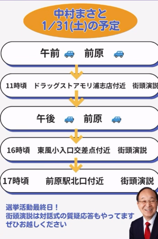 なお、予定時間を前後する場合もありますので、お近くの方は、選挙カーの放送を気にかけていただけると幸いです。